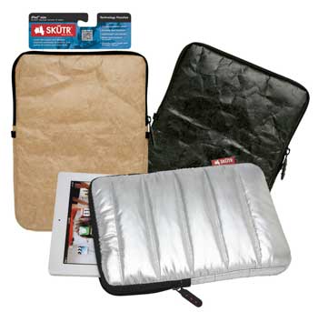 SKÜTR technology pouch Zippered padded pouches, durable, lightweight and flexible, water and Outside cover made with DuPont™ Tyvek®* or puffy jacket material, in various colors. Technology sizes for most e-readers, ipad, ipad mini, MS Surface and most 13-inch laptop computers. Art sizes fit letter size notepads and journals, 11 x 17-inch, and Available shoulder strap sold separately.